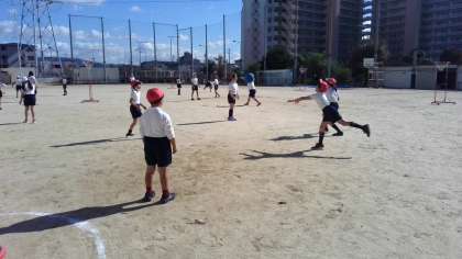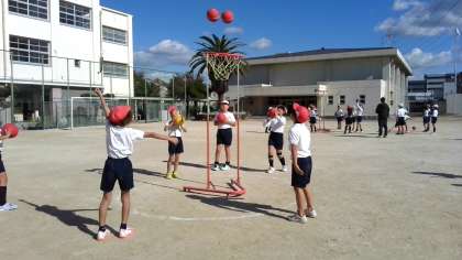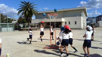 パスやシュートの練習をしていました。バスケットボールよりもシュートが入りやすくて楽しいです。