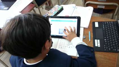 自分の考えをタブレットで撮影したり、ホワイトボードに書いたりして発表していました。