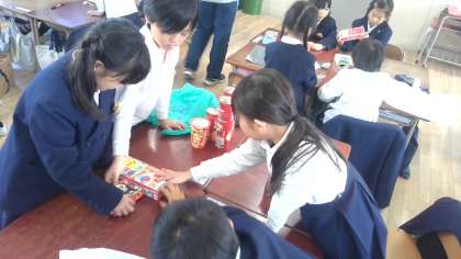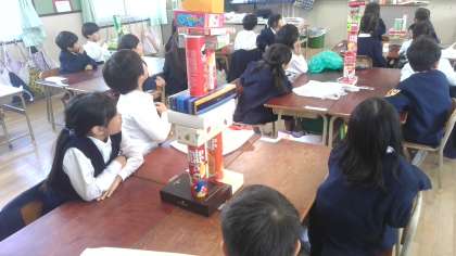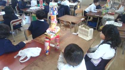 空き箱を積んでタワーを作ったり、その空き箱を形に注目して仲間分けしたりしていました。