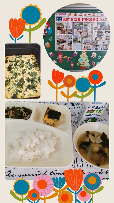 今日の給食の千草焼きは、卵の中に、鶏肉、とうふ、コーン、みつばが入っています。