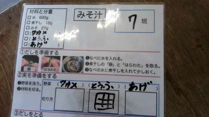みそ汁に入れる具を班で考えて、切り方や手順を確認していました。
