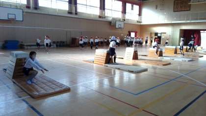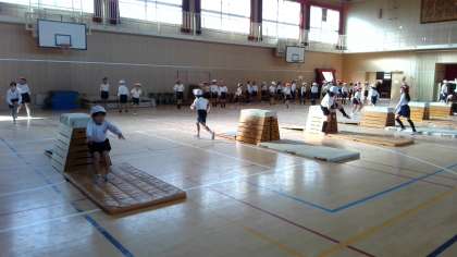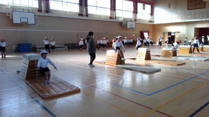 踏み切りや、手のつく場所に気をつけて練習していました。