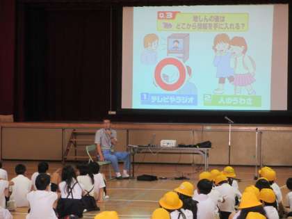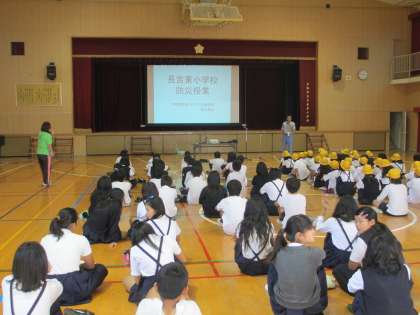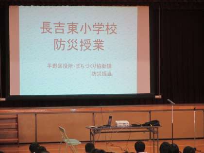 講堂で、平野区役所の方から、防災授業をしていただきました。