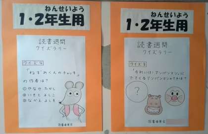 「いろいろな本を読んでもらいたい!」と、図書委員会の児童が、本を読むと分かるクイズラリーを企画してくれました。今日は、雨ということもあり、たくさんの児童がクイズラリーを楽しんでいました。