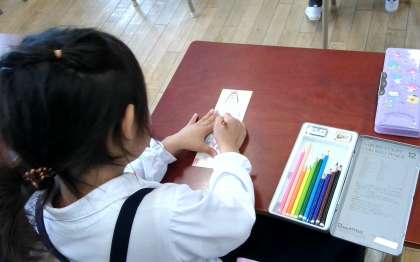 つくえにはっているお名前シールをよく見ながら自分の名前を書いていました。