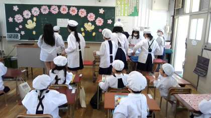6年生が1年生の給食を運んでくれています。 1年生が学校生活に慣れるまで、しばらくの間よろしくね。