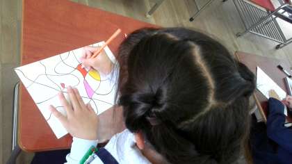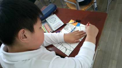 画用紙のはしからはしまで、途切れずに線をかきます。そして、できた形を1つずつていねいに色鉛筆でぬっていました。