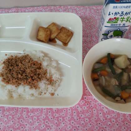 今日のこんだては、鶏肉とじゃがいもの煮もの、あつあげのしょうゆだれかけ、紅ざけそぼろ、ごはん、牛乳でした。
