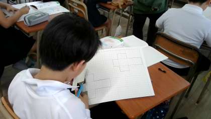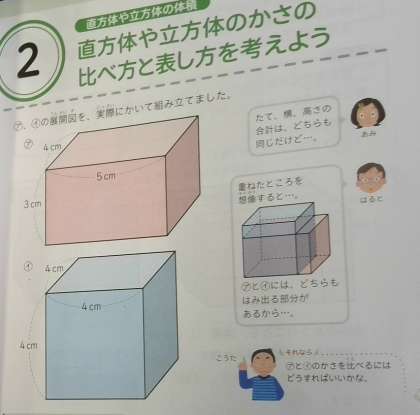 どうやったらかさが分かるかを考え、まずは直方体と立方体を作ってみることにしました。