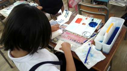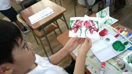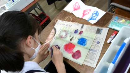 絵の具をつけたたこ糸を紙にはさんで引っ張ります。