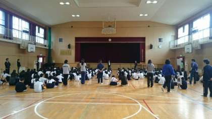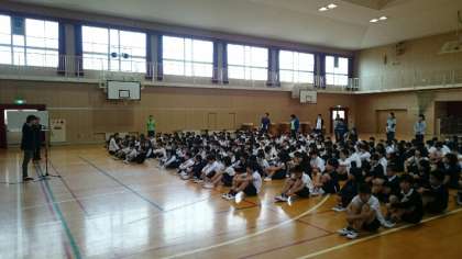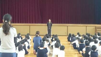 昨日からの雨で、運動場が使えず、体育館で朝会がありました。