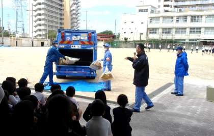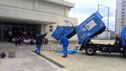 パッカー車を目の前にしながら、パッカー車の仕組みや、作業をするときに気を付けていることなどを教えていただきました。