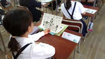 絵を見ながら、おなかいっぱいのとき、つかれたとき、ねむたいとき・・・などの表現を学習しました。
