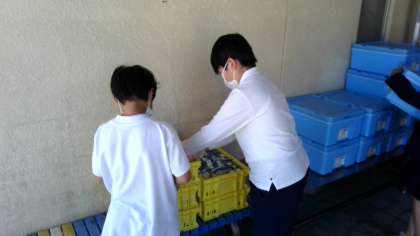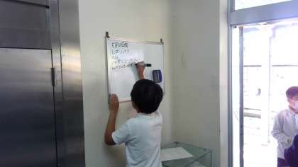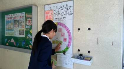 給食委員会は、今日の献立を放送したり、給食返却の手伝いをしたり、栄養黒板を書きかえたりしています。
