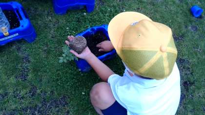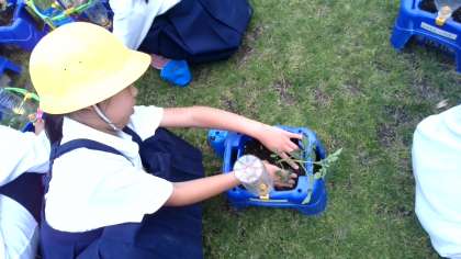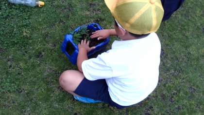 早く植え終わると、友だちが支柱をつけるのを手伝ってあげていました。