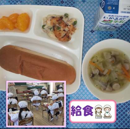 今日の給食は、人気メニューのマカロニグラタン!