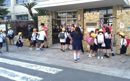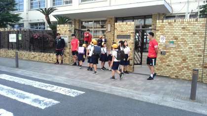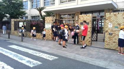 6年生の「夢授業(ラグビー)」でお世話になるレッドハリケーンズの方が、朝から門に立ってあいさつ運動をしてくださいました。