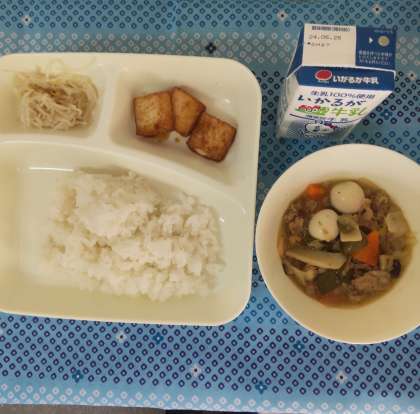 給食では、豚肉、うずら卵、キャベツ、玉ねぎ、人参、たけのこ、ピーマン、しいたけを使っています。