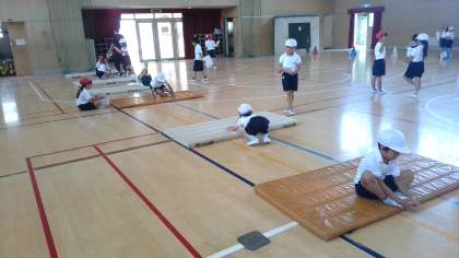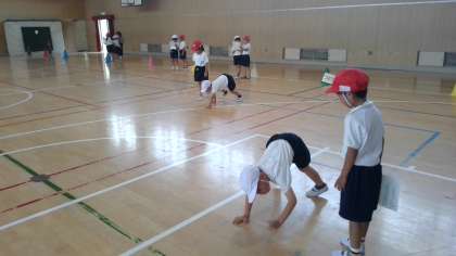 「くまあるき」や「うさぎとび」、「まえころがり」など、いろいろな技に挑戦していました。