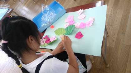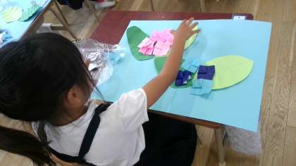 折り紙でつくったあじさいを、画用紙にはっていました。