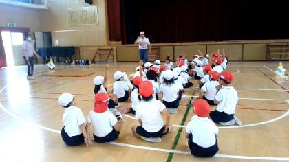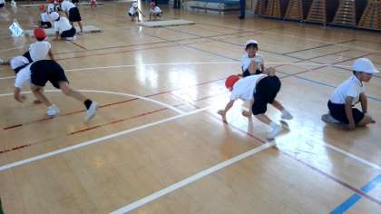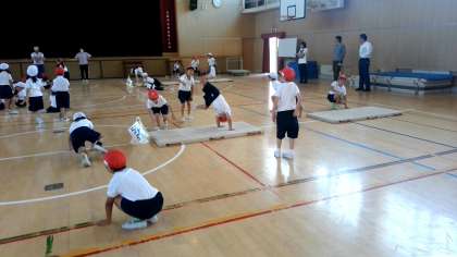 くまあるきや、かわとび、かえるのあしうちなど、友だちと教え合いながら、いろいろな動きにチャレンジしていました。