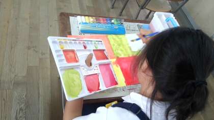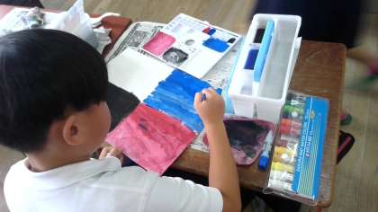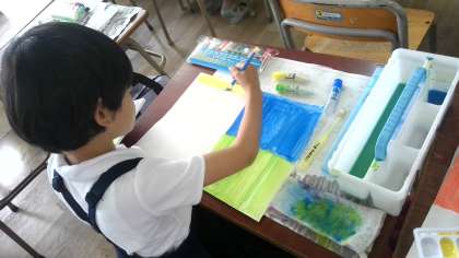 好きな色の絵の具を3色出して、四角い部屋をぬり分けていました。