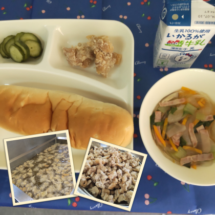 今日の給食は、大人気のから揚げや、おいしいスープ、きゅうりの中華あえ!