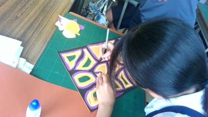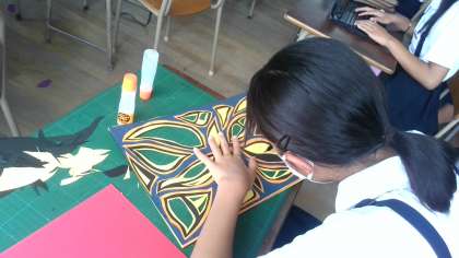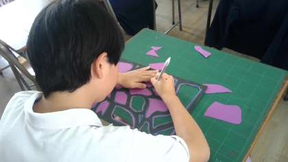 アートナイフで色画用紙をカットして、ペタッとはり合わせて作品を作っていました。