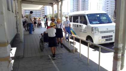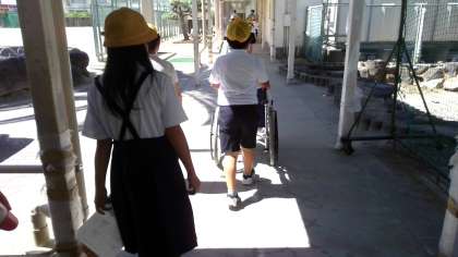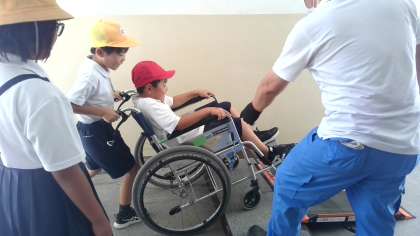 車いすを押すだけでなく、乗る体験もしました。乗る側も「ちょっとこわい」と不安そうでした。車いすに乗っている人に安心してもらうためには、声かけも大切なことを身をもって知ることができました。