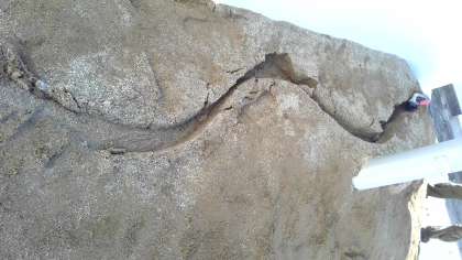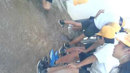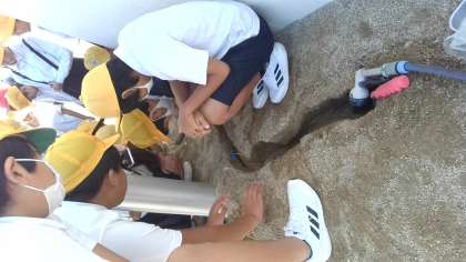 川のように水が流れるみぞをつくって、そこに水を流す実験をしていました。