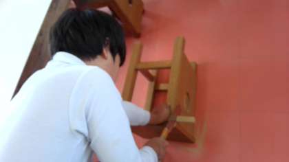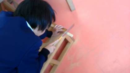 のこぎりで木を切って「ひみつのすみか」をつくります。