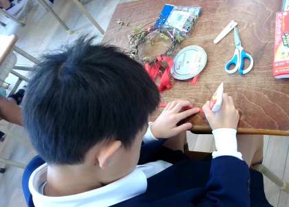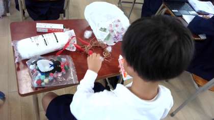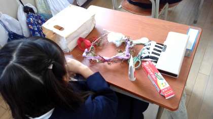 あさがおのつるで作ったリースにかざりつけをしていました。