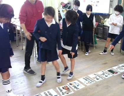 職業が書かれた英語カードを1つ1つ読みながら進み、出会ったところでじゃんけんをするゲームをしていました。