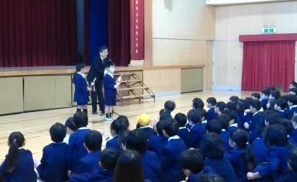 今日の児童朝会では、空手の表彰がありました。 いろいろなところで、長吉東の児童、がんばっています!