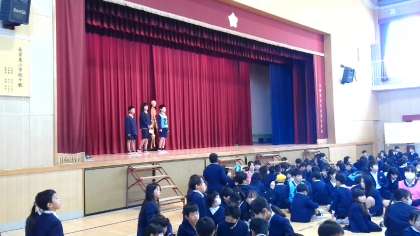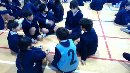 今日は、「いつもと違うところを7つ見つけよう」ということで、どこがちがっているかをグループのみんなで講堂を見まわして探していました。