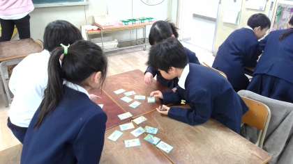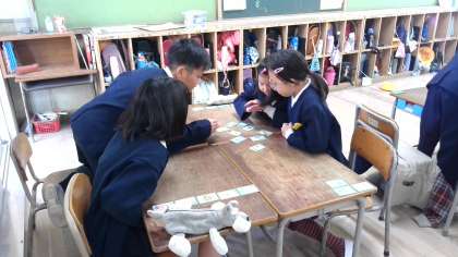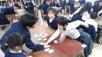 先生が読み札を読むのを集中して聞き、楽しそうに遊んでいました。