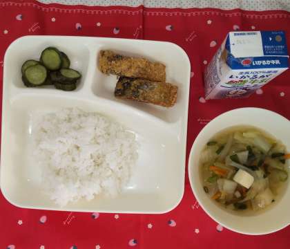 からだの温まる「五目汁」や、あっさりとした「きゅうりの甘酢あえ」と一緒に、おいしくいただきました。ごちそうさまでした!