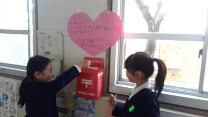 ポストの前で友だちと楽しそうにカードを書いていましたよ。