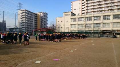 今学期の木曜日の児童集会は、講堂が使えないため、運動場ですることになっています。