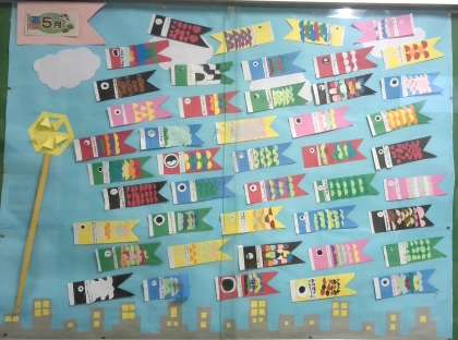 今月の玄関けいじは、5年生がつくりました。 こいのぼりに、1人1人願い事を書きました。
