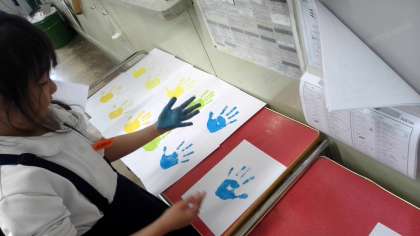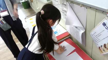学級目標のまわりにはる手形をとりました。