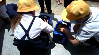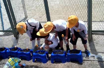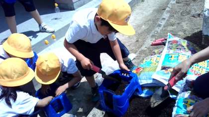 植木ばちに土を入れて、指で穴をあけて種を植えました。
