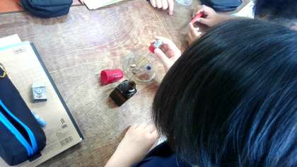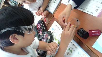 発芽する前の種子と発芽後しばらくたった子葉にヨウ素液を付けて、調べました。