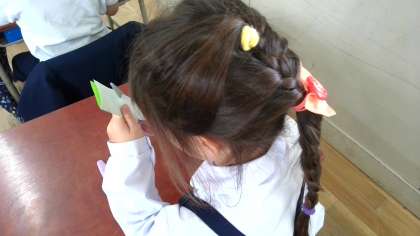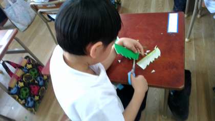 折り紙を2つ折りにして、ぎざぎざの葉っぱをイメージして切りました。