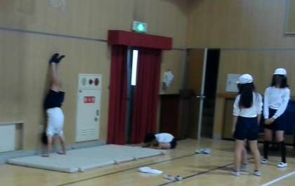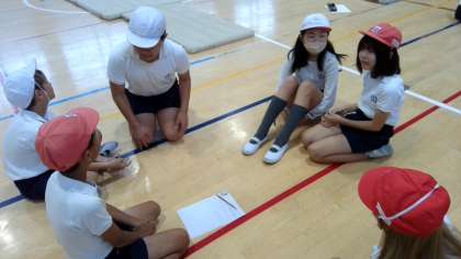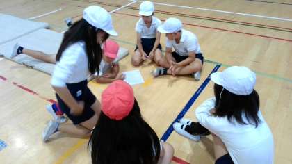 音楽に合わせて、どんな技を組み合わせるかをグループで話し合った後、練習しました。