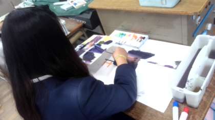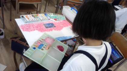 選んだ写真を画用紙にはって、そのまわりのまだ見ぬ世界を想像してかいていきます。