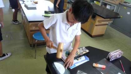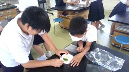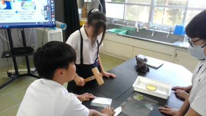1・2分煮た葉をろ紙にはさんで、木づちで軽くたたきます。