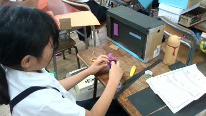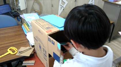 だんボールカッターで切ったり、ボンドではったり・・・さて、どんな作品ができあがるのかな。