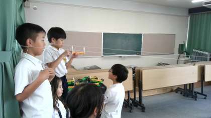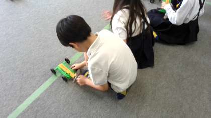 ゴムは、のばすだけでなく、ねじることによっても、ものを動かすことができることをプロペラカーで実験しています。