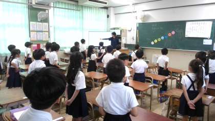 長吉東小学校の校歌を歌いました。 みなさんの学校の歌です。しっかり覚えてね。